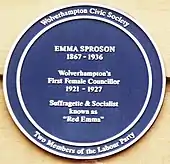 Emma Sproson (13 April 1867 – 22 December 1936), was a suffragette, then a suffragist, socialist, politician and women's rights activist. Active in the Midlands and from a working class background, she became Wolverhampton's first female councillor, gaining the nickname "Red Emma" in the process.
