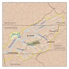 According to a 1910 article in the Rockwood Times by Captain William E. McElwee,[4] the river was named after "William Emery", an early traveler who drowned while swimming the river with his "accoutrements" on. Early deed books sometimes refer to this as "William Emeries River".[5] The Indian name for the Emory River was "Babahatchie", which means "babbling waters."[6]