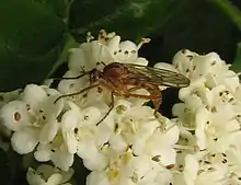 Empis tridentata is a species of dance flies in the family Empididae.[1][2][3] Trident-shaped gray mark, points forward, on yellowish thorax.[4]