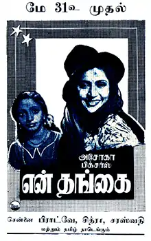 En Thangai (transl. My Younger Sister) is a 1952 Indian Tamil-language film starring M. G. Ramachandran and E. V. Saroja. The film is based on T. S. Natarajan's play of the same name. It was released on 31 May 1952.[1] The film was remade in Hindi as Chhoti Bahen, in Telugu as Aada Paduchu and in Kannada as Onde Balliya Hoogalu.