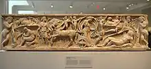 The mytheme of Endymion being not dead but endlessly asleep, which was proverbial (the proverb—Endymionis somnum dormire, "to sleep the sleep of Endymion")[22] ensured that scenes of Endymion and Selene were popular subjects for sculpted sarcophagi in Late Antiquity, when after-death existence began to be a heightened concern. The Louvre example, discovered at Saint-Médard-d'Eyrans, France (illustration above), is one of this class.