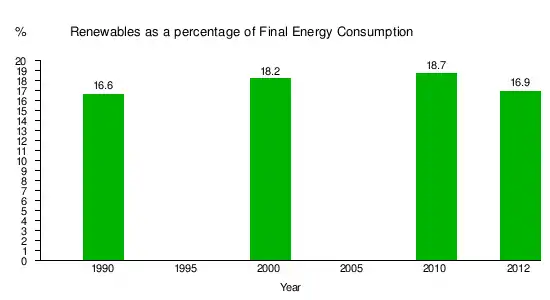 The portion of renewable energy as a percentage of final energy consumption in 2012 was 16.9%. Most of that was from the burning of traditional biofuels for heating.