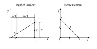 If the nodes are spaced evenly on the rectangular element then the strain will not contain the singularity. By moving nodes 5 and 8 position to a quarter of the length of the element closer to the crack tip as seen in figure 5, the mapping from becomes: