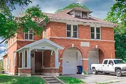 The first Kalamazoo hook and ladder company was established in 1846. By 1854 there were two companies, and the fire department continued to grow. In the early part of the 20th century, a number of new stations were constructed, and by 1910, the city had six stations.[2] Four of these[3] were designed by local architect Forrest D. Van Volkenberg, including Engine House No. 3. This station was constructed between 1907 and 1908, and it was used as a fire station by the city until 1980, when it was sold. As of 2013, the building was vacant.[4]