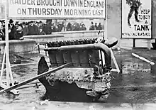 The engine of a Gotha V, shot down on 18 December 1917, put on public display at Trafalgar Square.
