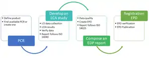 The first step in creating an EPD is defining the product, using the appropriate Product Category Rules (PCR). PCRs are specific rules and requirements verified by an independent, third-party panel. A Life Cycle Inventory (LCI) for the LCA must be verified and from reliable sources (for example, from a manufacturing facility). A Life Cycle Environmental Impact Analysis (LCIA) is performed by an LCA expert using software and a variety of assessment tools.[9] The EPD is delivered as a document or report following a series of verification reviews; it is then ready for registration and publication.[10][3][4][5][6] [11]