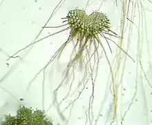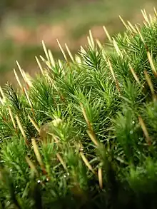 Moss gametophytes can be either asexual, female, male, or hermaphroditic like ferns. Unlike homosporous ferns, moss gametophytes can be either monoicous or dioicous (similar to monoecious and dioecious in vascular plants), with most studied dioicous species exhibiting genetic sex determination via the UV sex chromosome sex determination system. Some monoicous moss species such as Splachnum ampullaceum exhibit environmental sex determination during early development, with low light, low pH, and low nutrient availability all promoting male development.[22] In the presence of auxin, a widespread plant hormone, or gibberellins, compounds similar to Antheridiogen in ferns, both female and male individuals invest more in sexual structures (antheridia and archegonia).[23] Environmental sex determination in moss is fundamentally different from the spatial segregation of sexes, the occurrence of environmentally mediated sex ratios in moss patches, observed in sexually static moss species. Spatial segregation of the sexes in mosses is caused by differential survival rates between sexes as a result of the competitive advantage of female moss.[24][25] This leads to female dominated populations maintained by asexual reproduction and minimal sexual reproduction. In contrast, environmental sex determination is the dynamic development of females or males in different environmental conditions.