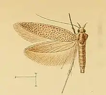 The wingspan is about 12 mm. The ground colour of the forewings is yellowish brown. The hindwings are dark grey.[2]