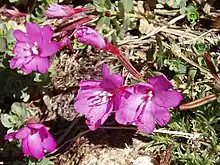 Epilobium obcordatum is a species of perennial plant in the evening-primrose family (Onagraceae), known by the common name rockfringe willowherb and rock fringe.[1] It is native to the western United States from California to Idaho, where it is found in rocky mountainous areas, at altitudes of 7,000 ft (2,100 m) to 13,000 ft (4,000 m).[2] This small perennial is clumpy to mat-forming and spreads from a woody caudex, especially in nooks between rocks. It has stems lined with oval or rounded leaves which spread parallel to the ground or ascend somewhat. At the tips of the thin stems are flowers each with four petals. The petals are magenta to purple, rounded and notched, often in a perfect heart shape, and are one or two centimeters long. The glandular, club-like, ridged fruit is a capsule two to four centimeters long growing on a short stalk.