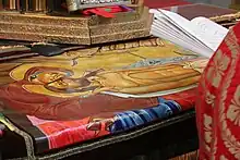 The Epitaphios (Greek: Ἐπιτάφιος, epitáphios, or Ἐπιτάφιον, epitáphion, meaning "above the tomb"; Slavonic: Плащаница, plashchanitsa; Arabic: نعش, naash) is a Christian religious icon, typically consisting of a large, embroidered and often richly adorned cloth, bearing an image of the dead body of Christ, often accompanied by his mother and other figures, following the Gospel account. It is used during the liturgical services of Good Friday and Holy Saturday in the Eastern Orthodox and Byzantine Catholic churches, as well as some Oriental Orthodox Churches. It also exists in painted or mosaic form, on wall or panel.