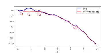 • From this process, we define the reflected process . This process can be seen as containing many successive excursion (not quite a Brownian excursion, see [12]). Because the drift of is dominated by , these excursions become shorter and shorter as . In particular, they can be sorted in order of decreasing lengths: we can partition into intervals of decreasing lengths such that restricted to is a Brownian excursion for any .