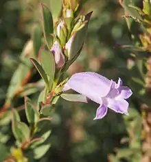 Eremophila christophori, commonly known as dolomite fuchsia bush,[2] is a flowering plant in the figwort family, Scrophulariaceae and is endemic to the southern part of the Northern Territory in Australia. It is an erect shrub with bright green leaves and white, pink or lilac flowers.