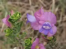 Eremophila cuneifolia, commonly known as pinyuru,[2] is a flowering plant in the figwort family, Scrophulariaceae and is endemic to the north-west of Western Australia. It is a spreading, sticky shrub with wedge-shaped leaves, coloured sepals and usually deep purple flowers.