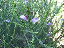 The flowers are borne singly in leaf axils on a stalk less than 1.5 mm (0.06 in) long. There are 5 narrow, tapering, green sepals which are 2–4 mm (0.08–0.2 in) long. The petals are 7–10.5 mm (0.3–0.4 in) long and joined at their lower end to form a tube. The tube is a shade of lilac to purple with the inside of the petal lobes lilac while the inside of the tube is white spotted with mauve or brown. The outside of the petal tube and lobes are glabrous except for the inside surface of the lower lobe which has long hairs along its centre line and the inside of the tube which is filled with long hairs. Two stamens are enclosed in the petal tube while the other 2 extend slightly beyond its end. The fruits are more or less cylindrical in shape, slightly flattened and 2–3.5 mm (0.08–0.1 in) long.[2][3]