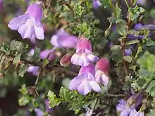 The flowers are borne singly or in pairs in leaf axils on a sticky stalk, usually 9–18 mm (0.4–0.7 in) long. There are 5 green to purplish-brown, lance-shaped to egg-shaped overlapping sepals which are very hairy on their inner surface. The petals are 16–23 mm (0.6–0.9 in) long and are joined at their lower end to form a tube. The petal tube is deep purple to mauve on the outside and white with yellow-brown spots inside. The outside of the tube and petal lobes are densely hairy but the inside of the lobes is glabrous and the inside of the tube is woolly. The 4 stamens are fully enclosed in the petal tube. Flowering occurs from March to October and is followed by woody, almost spherical fruits which have a hairy, papery covering and are 5.5–8.5 mm (0.2–0.3 in) in diameter.[2][3]
