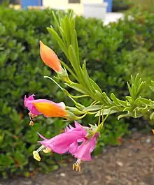 Eremophila racemosa, also known as showy eremophila,[2] is a flowering plant in the figwort family Scrophulariaceae, and is endemic to Western Australia. It is an erect shrub with glabrous leaves, small, green sepals and flowers that have many colour variations often changing as they age.