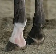 Like the chestnut, the ergot is thought to be a vestige of some part of the ancestral foot of the multi-toed Equidae, the ergot corresponding to the sole pad of other extant members of Perissodactyla, such as the tapir and rhinoceros.[1] Unlike the chestnut, which in the same individual may be large on the forelegs and smaller or even absent on the hindlegs, according to Ridgeway,[1] the ergot is of roughly equal size on all four legs. However, as stated above, it is often noted that the ergot can be absent on some or all legs.