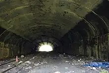 Bergen Arches is the common name for the Erie Cut, the Erie Railroad's mile-long, four-track cut which linked the railroad's main line to its Hudson River waterfront Pavonia Terminal, where travelers to Manhattan could transfer to the Pavonia Ferry or the Hudson and Manhattan Railroad.[1] From 1906 to 1910,[2] using 250,000 pounds of dynamite, workers blasted through 800,000 cubic yards (610,000 m3) of blue trap rock; 160,000 cubic yards (120,000 m3) of earth were excavated. There were construction cost overruns (and settlements paid to local homeowners for damage and injuries from flying rock), with a total cost around $5 million, that led to financial trouble for the Erie and the cancellation of plans to build a new terminal along the Jersey City waterfront.[3] The term "Bergen Arches" originally referred to the massive bridges over the cut, but the two terms have become synonymous.