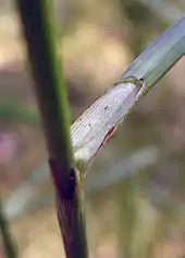 In the wild, Eriophorum angustifolium is a creeping rhizomatous perennial sedge,[3] with an abundance of unbranched, translucent pink roots.[4] Fully grown, it has a tall, erect stem shaped like a narrow cylinder or triangular prism; it is smooth in texture and green in colour. Reports of the plant's height vary; estimates include up to 60 cm (24 in),[5] 15–75 cm (5.9–29.5 in),[6] and up to 100 cm (39 in).[2] E. angustifolium has "stiff grass-like foliage" consisting of long, narrow solidly dark green leaves, which have a single central groove, and narrow from their 2–6-millimetre (0.08–0.24 in) wide base to a triangular tip.[3][7] Up to seven green and brown aerial peduncles and chaffs, roughly 4–10 millimetres (0.16–0.39 in) in size, protrude from umbels at the top of the stem from which achenes are produced after fertilisation, each with a single pappus; these combine to form a distinctive white perianth around 5 centimetres (2.0 in) long.[3][8]