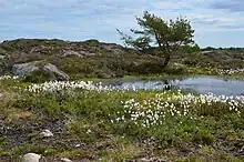 Eriophorum angustifolium, commonly known as common cottongrass or common cottonsedge, is a species of flowering plant in the sedge family, Cyperaceae. Native to North America, North Asia, and Europe, it grows on peat or acidic soils, in open wetland, heath or moorland. It begins to flower in April or May and, after fertilisation in early summer, the small, unremarkable brown and green flowers develop distinctive white bristle-like seed-heads that resemble tufts of cotton; combined with its ecological suitability to bog, these characteristics give rise to the plant's alternative name, bog cotton.