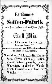 From 1863 until World War II, Ernst Mix's company operated a soap and candle factory in this facility. The address then was 42 Danziger strasse.