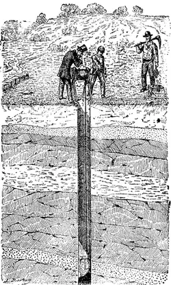 It consisted of a very powerful incandescent lamp enclosed in a metallic cylinder. One of the two semi-cylindrical sides constitutes the reflector, and the other, which is of thick glass, allows the passage of light, which illuminates the strata of earth traversed by the instrument. The base, which is inclined at an angle of 45°, is an elliptical mirror, and the top, of straight section, is open in order to permit the observer standing at the mouth of the well, and provided with a powerful spyglass, to see in the mirror the image of the geological layers or of the structure of crystalline rocks. It somewhat resembles to a kind of inverted semi-periscope aimed to look at earth downwards. The lamp is so mounted that its upwardly emitted rays are intercepted.