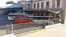 The bus station occupies the whole of the west wing of the former station, with the building housing ticket offices, waiting areas, a range of shops and restaurants, and other ancillary facilities. The coaches stop in an open area to the north-west of this building, which is surrounded by 47 angled bus stops. Two pedestrian bridges, and pedestrian crossings, link the station building to those stops that are not alongside the main building.[2][3][6]