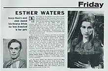 Esther Waters is a British period television series which originally aired on BBC 2 in four episodes from 14 November to 5 December 1964. It is an adaptation of the 1894 novel of the same title by George Moore.[1] Like the novel it focuses on the struggle of Esther Waters who, in Victorian England, is abandoned by her lover when pregnant. Despite the social stigma of being a fallen woman she chooses to raise the child as a single mother.