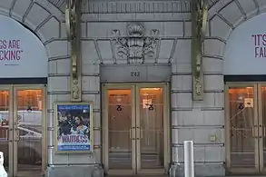 On either side of the doors are terracotta niches with bronze-framed sign boards. Above the signboards are terracotta wreaths, which surround circular panels with the gilded letters "The Barrymore Theater". Each wreath is topped by a curved pediment. The western and eastern portions of the facade are recessed slightly and contain recessed openings.[15] The opening to the east is marked as the stage door.[10][15] A frieze, decorated with leaf and wave moldings, runs above the first floor.[15] To the east, there was originally a stage house with fire escapes on its facade, but this has since been replaced with the Morgan Stanley Building.[17]