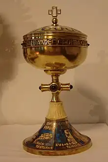 One of the first possible references to reserving the Blessed Sacrament for adoration is found in the life of St. Basil (died AD 379). Basil is said to have divided the Eucharistic bread into three parts when he celebrated the Divine Liturgy in the monastery. One part he consumed, the second part he gave to the monks, and the third he placed in a golden dove-shaped container suspended over the altar.[16] This separate portion was probably to reserve the sacrament for distribution to the sick who were unable to attend the liturgy.[17]