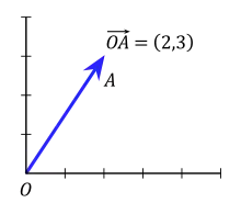 As an example in two dimensions (see figure), the vector from the origin O = (0, 0) to the point A = (2, 3) is simply written as