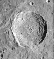 Eudoxus is a prominent lunar impact crater that lies to the east of the northern tip of the Montes Caucasus range. It is named after the Greek astronomer Eudoxus of Cnidus.[1] It is located to the south of the prominent crater Aristoteles in the northern regions of the visible Moon. To the south is the ruined formation of Alexander, and the small crater Lamèch lies to the southwest.