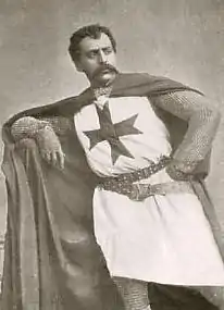 During the last few years of his life, Oudin also translated the lyrics of French songs and arias into English and also wrote the words and music of several songs.[12] Oudin died at his London home in 1894 aged 36.[13] He was buried in Brompton Cemetery, and Sir Arthur Sullivan was present at the funeral, having sent flowers "in the shape of a large Templar cross",[14] recalling Oudin's greatest role in a work of Sullivan's. A benefit concert was held for his widow and children in London in 1895, which raised £1,000.