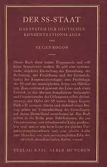 Right after being liberated in 1945, Kogon again began working as a journalist. He worked as a volunteer historian for the United States Army at Camp King and began writing his book Der SS-Staat: Das System der deutschen Konzentrationslager ("The SS-State: The System of the German Concentration Camps"), first published in 1946, which still stands as a basic reference on Nazi crimes. The book was translated into several languages, in English, as The Theory and Practice of Hell. The German language version alone sold 500,000 copies.