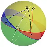 Now let us suppose that O′ is the image of O. Then we know ∠αAO = ∠AaO′ and orientation is preserved,[lower-alpha 1] so O′ must be interior to ∠αAa. Now AO is transformed to aO′, so AO = aO′. Since AO is also the same length as aO, then aO = aO′ and ∠AaO = ∠aAO. But ∠αAO = ∠aAO, so ∠αAO = ∠AaO and ∠AaO = ∠AaO′. Therefore O′ is the same point as O. In other words, O is a fixed point of the transformation, and since the center is also a fixed point, the diameter of the sphere containing O is the axis of rotation.