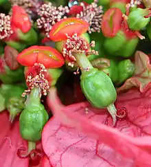The female flowers reduced to a single pistil usually split into three parts, often with two stigmas at each tip. Male flowers often have anthers in twos. Nectar glands usually occur in fives,[16] may be as few as one,[16] and may be fused into a "U" shape.[15] The cyathophylls often occur in twos, are leaf-like, and may be showy and brightly coloured and attractive to pollinators, or be reduced to barely visible tiny scales.