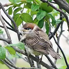 Predators of the Eurasian tree sparrow include a variety of accipiters, falcons and owls, such as the Eurasian sparrowhawk,[50] common kestrel,[54] little owl,[55][56] and sometimes long-eared owl and white stork.[57][58] It does not appear to be at an increased risk of predation during its autumn moult, despite having fewer flight feathers at that time.[59] Nests may be raided by Eurasian magpies, jays, least weasels, rats, cats, and constricting snakes such as the horseshoe whip snake.[60][61][62]