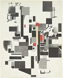 The next of the new styles was dadaism, a movement of reaction to the disasters of World War I, which involved a radical approach to the concept of art, which loses any component based on logic and reason, and claims the doubt, chance, the absurdity of existence. This translated into a subversive language, where both the themes and the traditional techniques of art were questioned, experimenting with new materials and new forms of composition, such as collage, the photomontage and the readymade.[47] Among its representatives is Jean Arp, painter, sculptor and poet, one of the founders of the movement in Zurich. In 1916 he illustrated Tristan Tzara's 25 Poems and made the woodcut series Symmetry Studies, of abstract cut. Since then he continued to produce etchings and, above all, woodcuts, with a sober style in carving and sharp in ink, with images that move between abstraction and morphology. He also illustrated his own texts: Sailboat in the forest (1957), 1, rue Gabrielle (1958), Towards the infinite white (1960).[48] Also notable was Kurt Schwitters, who produced in 1923 a series of six lithographs of his work Merz, in a numbered edition of fifty copies. He elaborated it on papers of different colors, so it obtained a certain appearance of collage.[49] Another exponent was Christian Schad, a contributor to the magazine Sirius, for which he produced one woodcut per issue, and for whose publisher he created a booklet of ten woodcuts in 1915.[50]