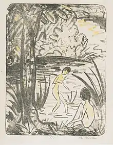 Its first reference was the group Die Brücke, founded in Dresden in 1905 by Ernst Ludwig Kirchner, Fritz Bleyl, Erich Heckel and Karl Schmidt-Rottluff; later Emil Nolde, Max Pechstein and Otto Mueller joined. Influenced by German Gothic—Kirchner studied Durero's woodcuts in depth—African art, Arts and Crafts, Jugendstil, the Nabis and artists such as Van Gogh, Gauguin and Munch, were interested in a type of subject matter centered on life and nature, reflected in a spontaneous and instinctive way, so their main themes are the nude -whether indoors or outdoors-, as well as circus and music-hall scenes, where they find the maximum intensity they can extract from life.[24] Die Brücke gave special importance to graphic works: their main means of expression was woodcut, a technique that allowed them to capture their conception of art in a direct way, leaving an unfinished, raw, wild look, close to the primitivism they admired so much. These woodcuts present irregular surfaces, which they do not disguise and take advantage of in an expressive way, applying spots of color and highlighting the sinuosity of the forms. They also used lithography, aquatint and etching, giving reduced chromaticism and stylistic simplification.[25]