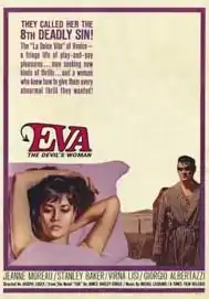 Eva, released in the United Kingdom as Eve, is a 1962 Italian-French co-production drama film directed by Joseph Losey and starring Jeanne Moreau, Stanley Baker, and Virna Lisi. Its screenplay is adapted from James Hadley Chase's 1945 novel Eve.[1]