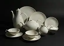 In 1942, Zeisel was commissioned by the Museum of Modern Art and Castleton China to design a set of modern, porcelain, undecorated china that would be worthy of exhibition at MoMA, to be produced for sale by Castleton. The resulting exhibition, "New Shapes in Modern China Designed by Eva Zeisel," ran from April 17 to June 9, 1946, and was the first one-woman exhibition at MoMA. It was received with wide praise, but because of wartime constraints the porcelain dishware did not go into production until 1949. Zeisel's dishes, known as "Museum" and "Castleton White," were manufactured and sold over the next several decades, initially in all-white as designed by Zeisel, and later with a wide variety of decorations. Zeisel credited this commission with establishing her reputation in the US, remarking that, "it made me an accepted first-rate designer rather than a run-of-the-mill designer."[14]