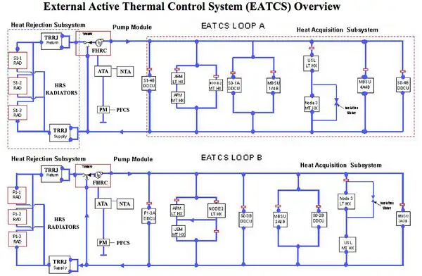 The International Space Station (ISS) External Active Thermal Control System (EATCS)[1] maintains an equilibrium when the ISS environment or heat loads exceed the capabilities of the Passive Thermal Control System (PTCS). Note Elements of the PTCS are external surface materials, insulation such as Multi-Layer Insulation (MLI), or Heat Pipes. The EATCS provides heat rejection capabilities for all the U.S. pressurized modules, the Japanese Experiment Module (JEM), the Columbus Orbital Facility (COF), and the main power distribution electronics of the S0, S1 and P1 Trusses. The EATCS consists of two independent Loops (Loop A & Loop B), which both use mechanically pumped fluid state ammonia in closed-loop circuits. The EATCS is capable of rejecting up to 70 kW, and provides a substantial upgrade in heat rejection capacity from the 14 kW capability of the Early External Active Thermal Control System (EEATCS) via the Early Ammonia Servicer (EAS), which was launched on STS-105 and installed onto the P6 Truss.[1]