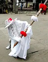 The word "Eyo" also refers to the costumed dancers, known as the masquerades that come out during the festival. The origins of this observance are found in the inner workings of the secret societies of Lagos.[5] Back in the day, the Eyo festival was held to escort the soul of a departed Lagos King or Chief and to usher in a new king. On Eyo Day, the main highway in the heart of the city (from the end of Carter Bridge to Tinubu Square) is closed to traffic, allowing for procession from Idumota to the Iga Idunganran palace. The white-clad Eyo masquerades represent the spirits of the dead, and are referred to in Yoruba as "agogoro Eyo" (literally: "tall Eyo").[6]