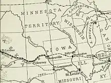 Ezra Meeker married his childhood sweetheart, Eliza Jane Sumner, in May 1851.[6] The Sumners lived about four miles (6 km) from Indianapolis, and like the Meekers were family farmers who did not hire help. When he asked her for her hand, he told her he wanted to farm, which she accepted as long as it was on their own property. In October 1851, the couple set out for Eddyville, Iowa, where they rented a farm. They had heard that land in Eddyville would be free, but this was not the case. Ezra, working in a surveyor's camp, decided that he did not like Iowa's winters—a prejudice shared by his pregnant wife. Reports were circulating through the prairies about the Oregon Territory's free land and mild climate. Also influencing the decision was the urging of Oliver Meeker who, with friends, had outfitted for the trip to Oregon near Indianapolis, and had come to Eddyville to recruit his brother. Ezra and Eliza Jane Meeker vacillated on the decision, and it was not until early April 1852, more than a month after the birth of their son Marion, that they decided to travel the Oregon Trail.[6][7][8][9][10]