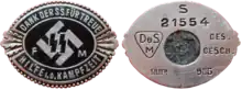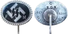 A Förderndes Mitglied der SS (SS-FM; SS Patron Members) was a member of the Allgemeine SS (General SS) who did not take part in active duty, but instead contributed financially to the SS. The SS-FM was organised by the SS Main Economic and Administrative Office, and started in 1926. Members of the SS-FM made monthly payments towards the work of the SS at their local SS headquarters. For people with low income, contributions were low; no minimum contribution was prescribed. Each member was issued with a lapel pin and a receipt book. From April 1934, members also received a monthly magazine - FM-Zeitschrift- which was produced by the SS High Command.[1][2] By 1939, circulation of FM-Zeitschrift was approximately 365,000,[1] but few copies of the magazine survive today.[2]
