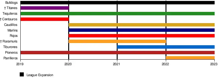 The league held its inaugural season in 2019 with five teams: Bulldogs de Naucalpan, Centauros de Ciudad Juárez, Pioneros de Querétaro, Tequileros de Jalisco and the Titanes de la Ciudad de México. The Pioneros finished as the first league champions after beating the Centauros 16–0 in the final.[4]