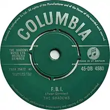 "F.B.I." was written by the Shadows' Hank Marvin, Bruce Welch and Jet Harris, but due to complicated publishing contracts it was credited to their manager Peter Gormley.[3] The actual composers' names never appeared on the credits. It was released as a single by EMI on the Columbia label, with the B-side "Midnight", written by Marvin and Welch.[4] It was released in the United States and Canada in July 1961 on Atlantic Records with "The Frightened City", written by Norrie Paramor, as the B-side.[5]