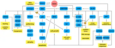 It remains an area of active research how DUX4 protein causes muscle damage.[69] DUX4 protein is a transcription factor that regulates many other genes. Some of these genes are involved in apoptosis, such as p53, p21, MYC, and β-catenin, and indeed it seems that DUX4 protein makes muscle cells more prone to apoptosis. Other DUX4 protein-regulated genes are involved in oxidative stress, and indeed it seems that DUX4 expression lowers muscle cell tolerance of oxidative stress. Variation in the ability of individual muscles to handle oxidative stress could partially explain the muscle involvement patterns of FSHD. DUX4 protein downregulates many genes involved in muscle development, including MyoD, myogenin, desmin, and PAX7, and indeed DUX4 expression has shown to reduce muscle cell proliferation, differentiation, and fusion. DUX4 protein regulates a few genes that are involved in RNA quality control, and indeed DUX4 expression has been shown to cause accumulation of RNA with subsequent apoptosis.[67] Estrogen seems to play a role in modifying DUX4 protein effects on muscle differentiation, which could explain why females are lesser affected than males, although it remains unproven.[70]