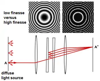 Fabry–Pérot interferometer, using a pair of partially reflective, slightly wedged optical flats. The wedge angle is highly exaggerated in this illustration; only a fraction of a degree is actually necessary to avoid ghost fringes. Low-finesse versus high-finesse images correspond to mirror reflectivities of 4% (bare glass) and 95%.