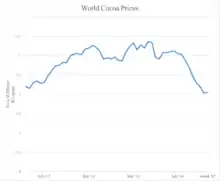 Typically, the farmers who grow the cocoa beans only receive 3.2% of the price of the final cocoa bar.[13] In Ghana and the Ivory Coast, the two largest contributors of chocolate in the world,[14] farmers will make as little $0.50 per day and the majority of their income is dependent on cocoa farming.[15] In the past thirty years, cocoa prices have been as low as $714 per ton in 2000 to as high as $3,775 per ton in spring of 2011. Although the market price of cocoa fluctuates, fair trade certification has created a minimum price for which the cocoa farmers must be paid per ton.[16] The farmers receive either the market price or the fair trade minimum, whichever is higher.[17] In January 2011, Fairtrade International (FLO) created an international standard for the minimum price fair trade cocoa farmers receive per ton of cocoa. It was increased from $1600 to $2000 per metric ton of cocoa. The minimum price set by Fair Trade ensures a consistent minimum wage for farmers. This gives farmers financial stability and the ability to plan for future events. This consumption smoothing yields to a better quality of life for the farmers and their families.